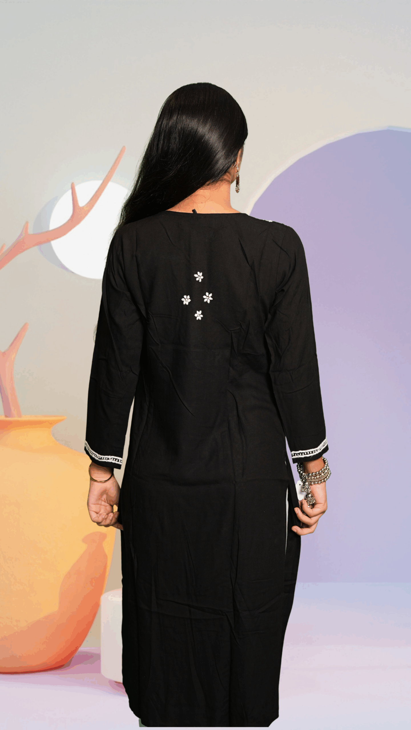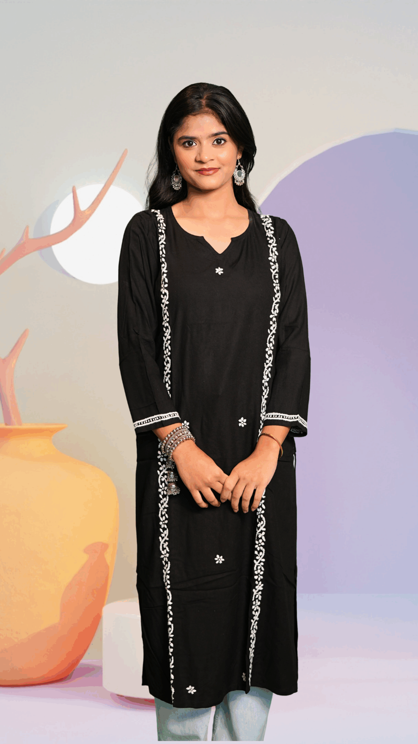 A graceful black rayon kurta beautifully detailed with intricate white chikankari embroidery. Soft,