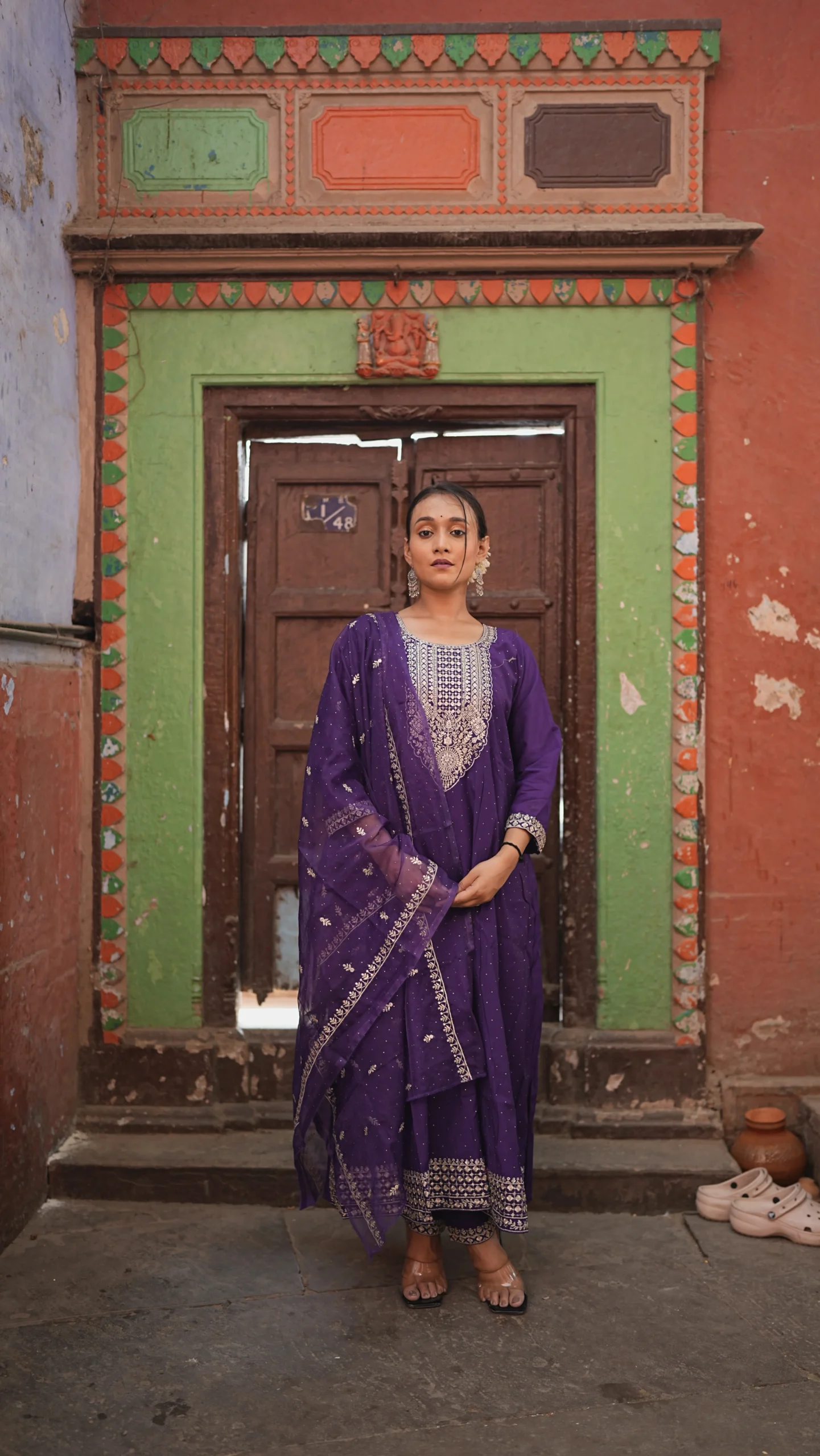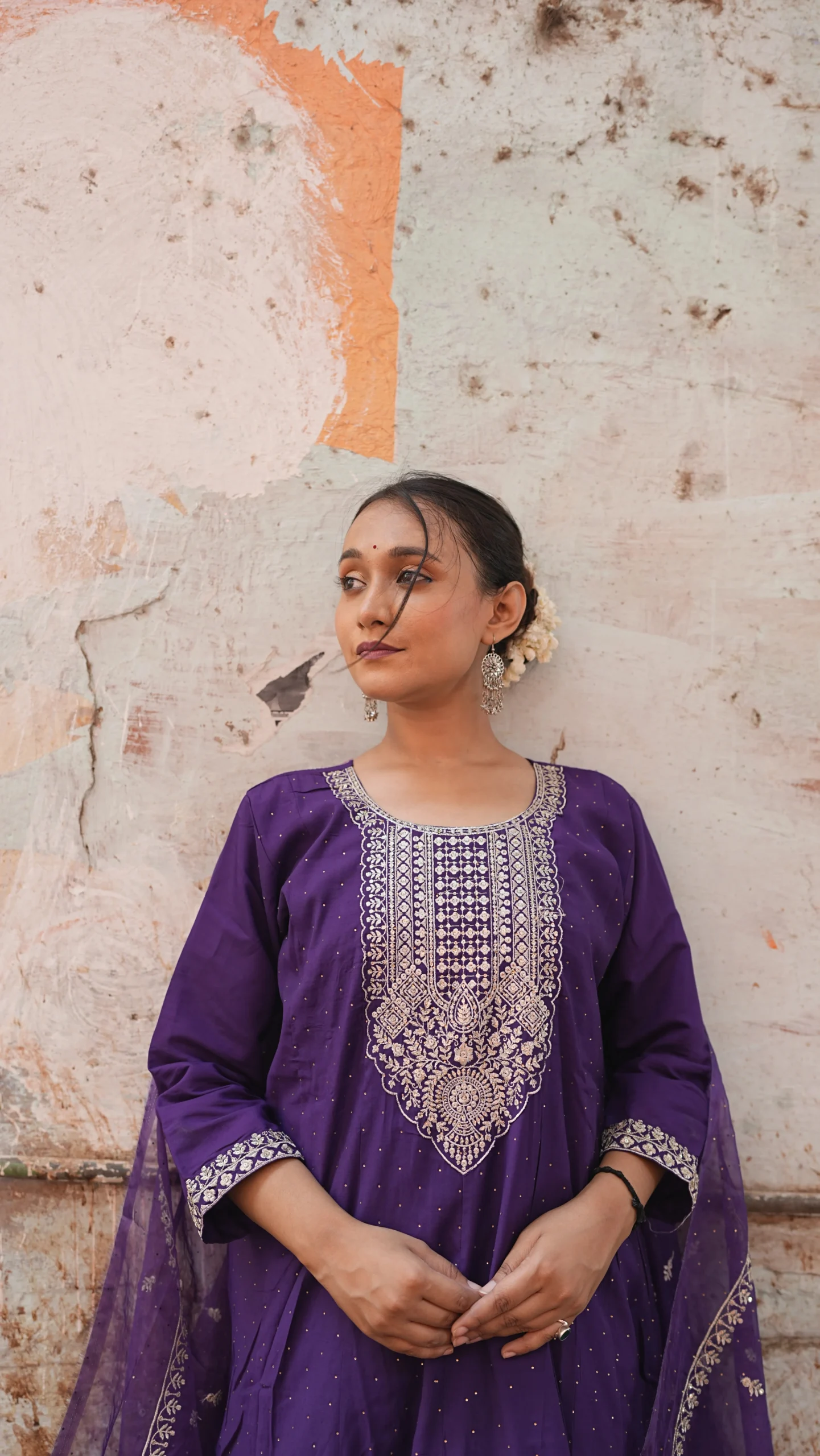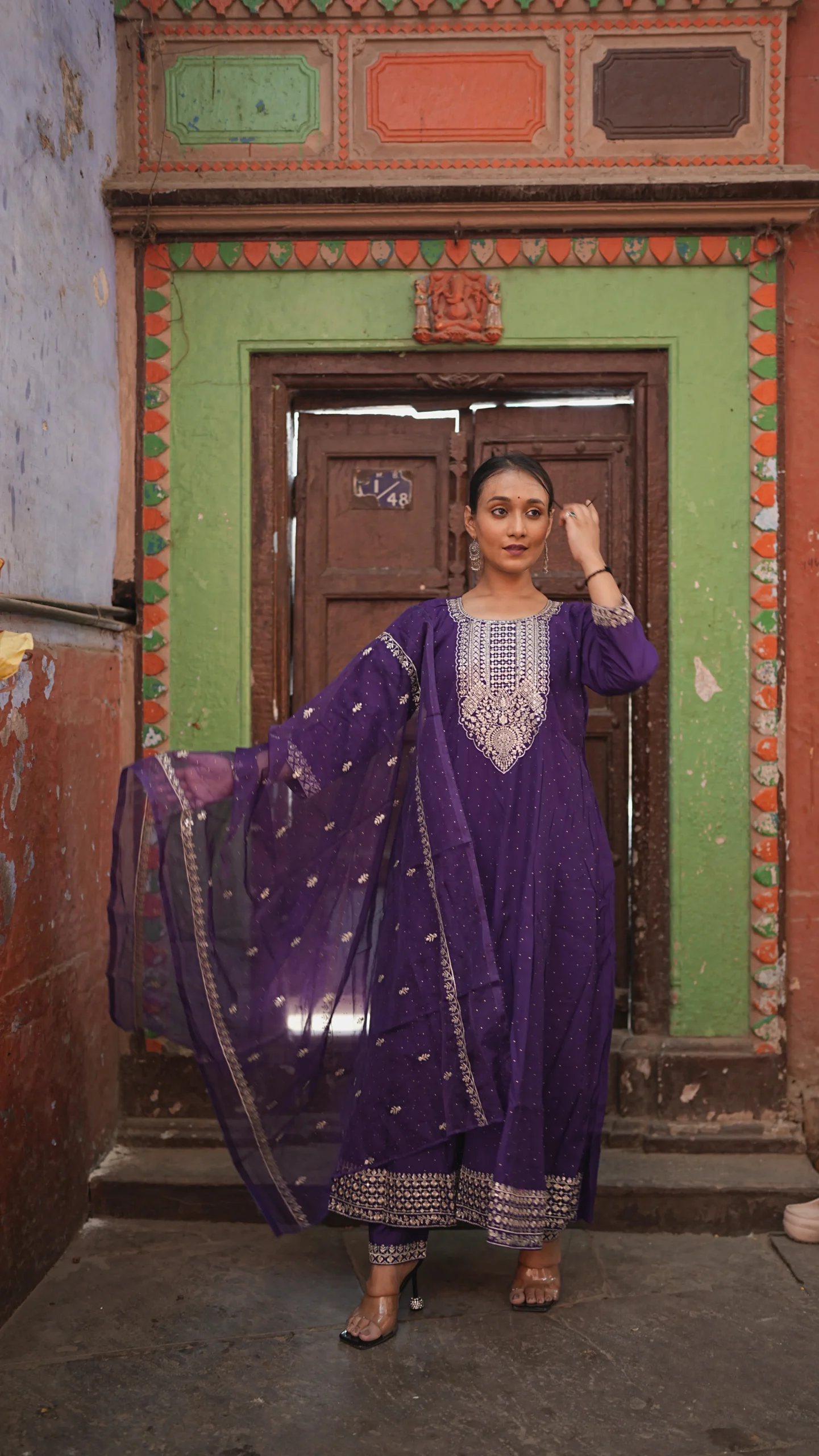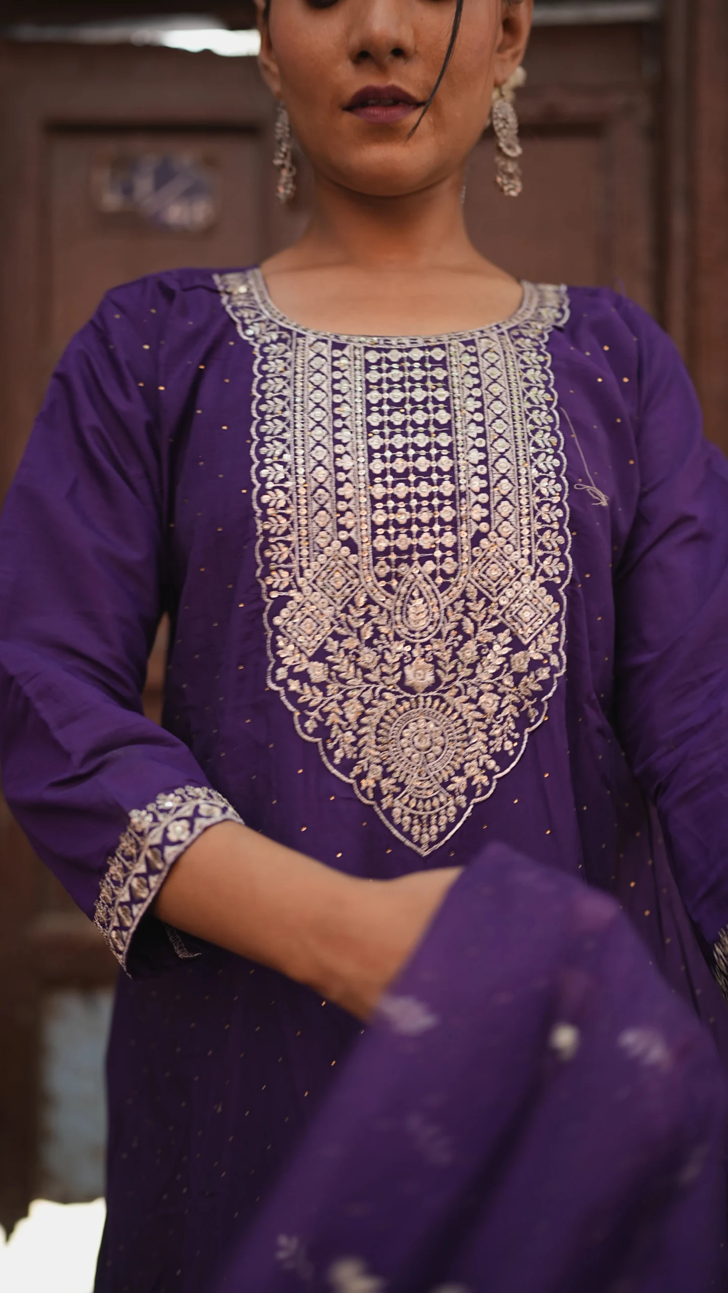 Elegant purple Anarkali suit set adorned with all-over silver embroidery, paired with a matching dupatta and pant style lower.Perfect for festive and special occasions.