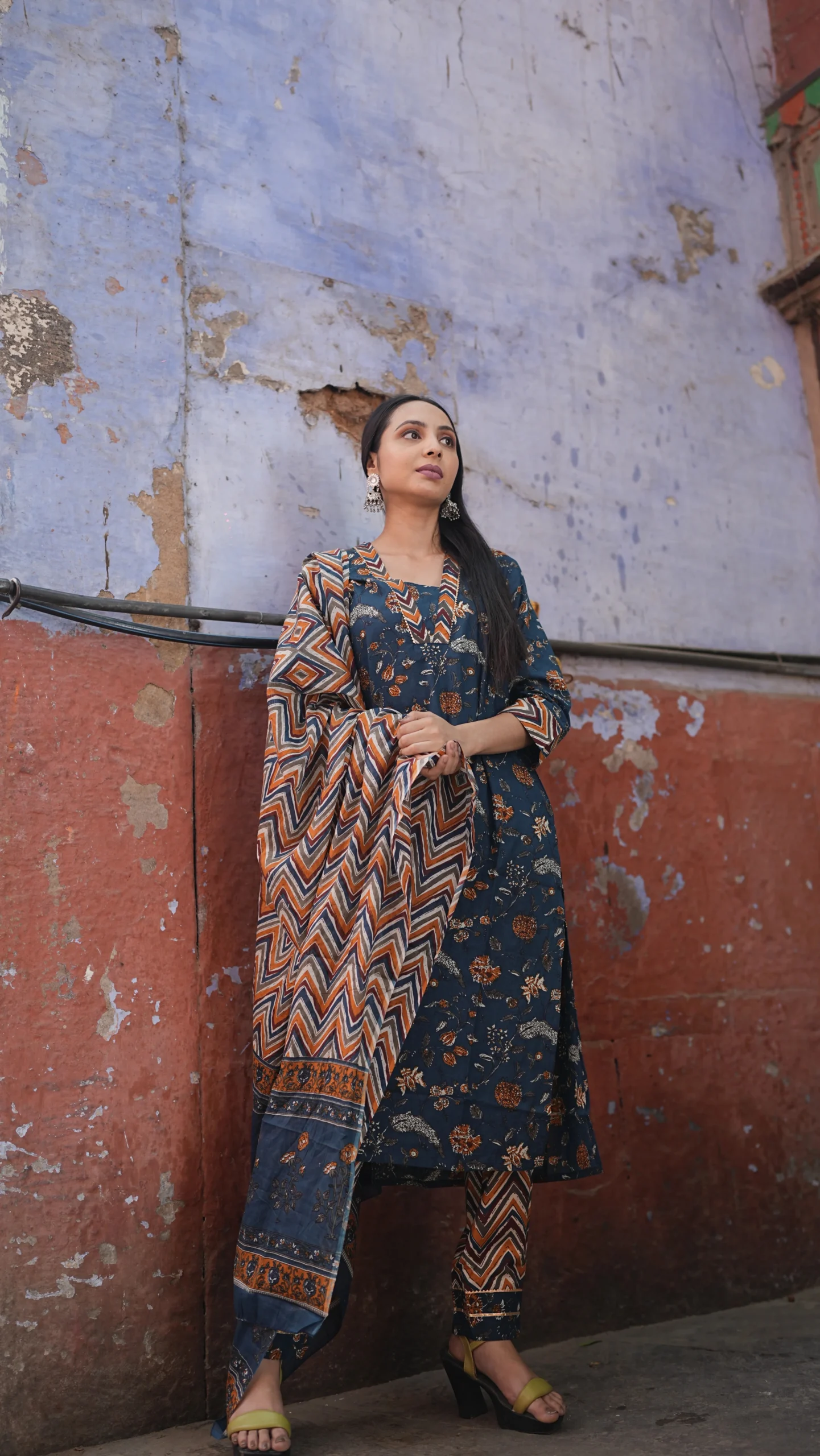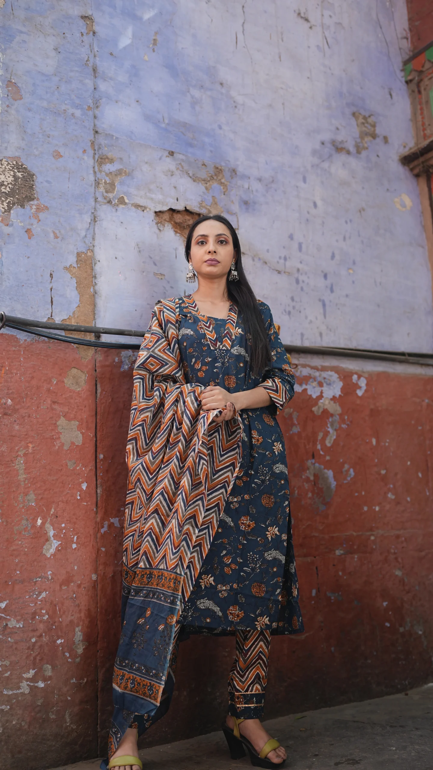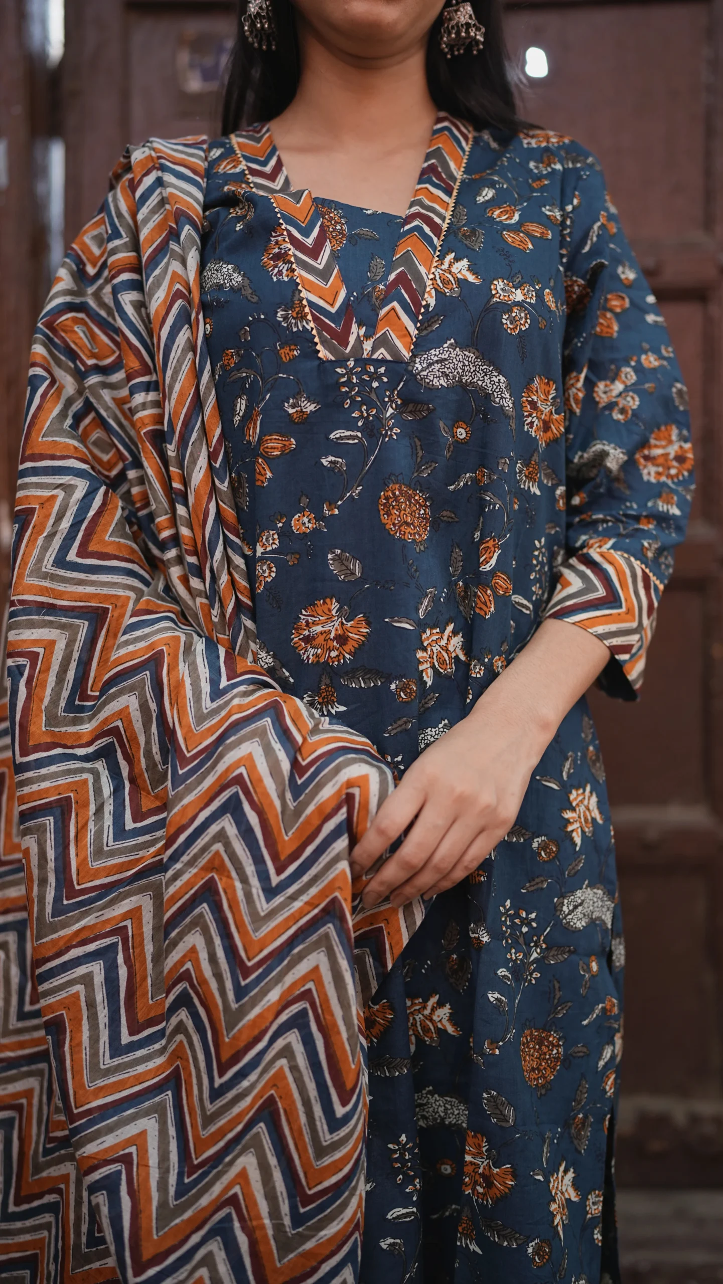 Blue authentic Jaipuri print suit set from Jaipur, paired with a matching dupatta and pant style lower.Vibrant, comfortable, and rich in Jaipuri charm.