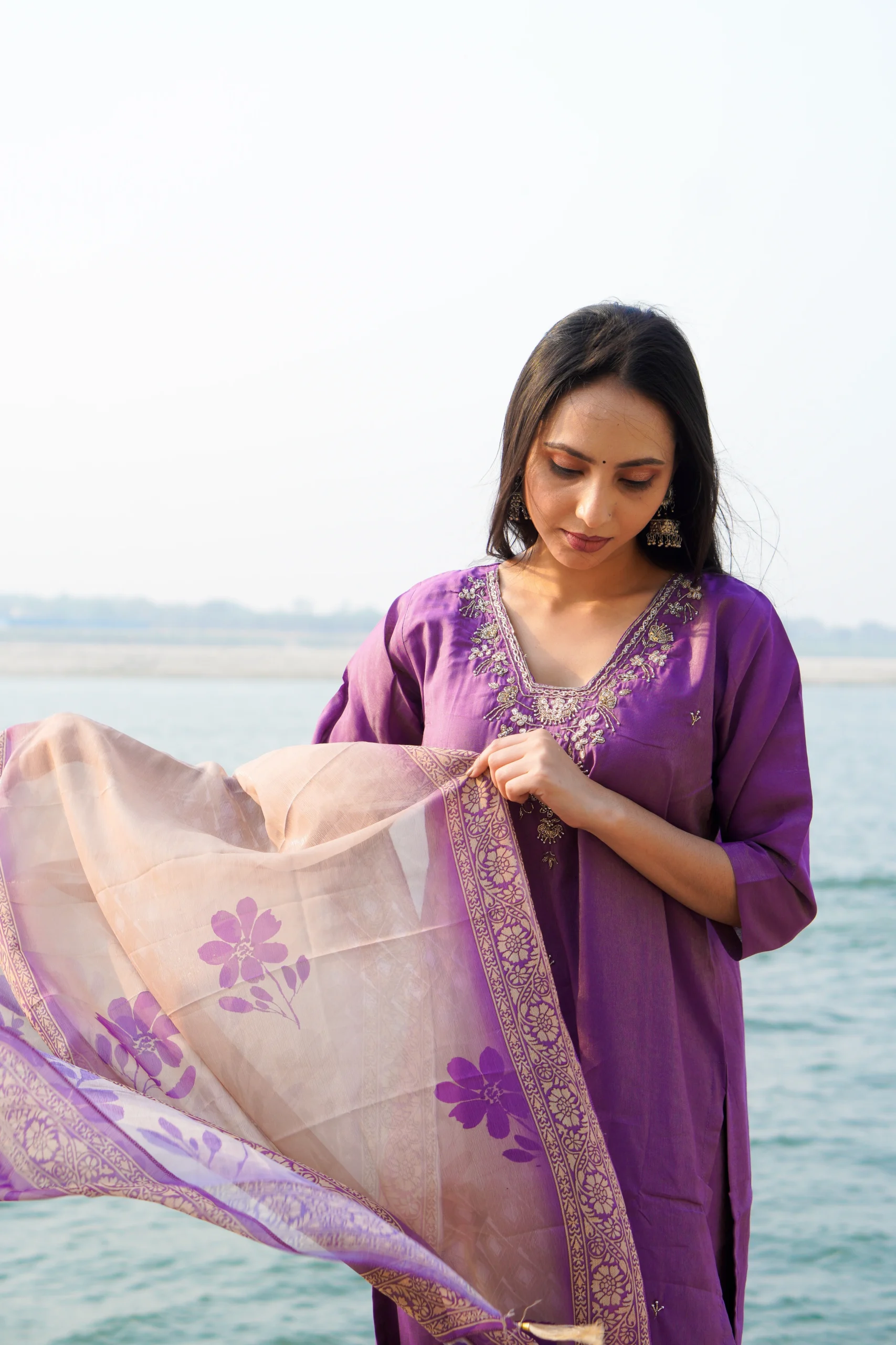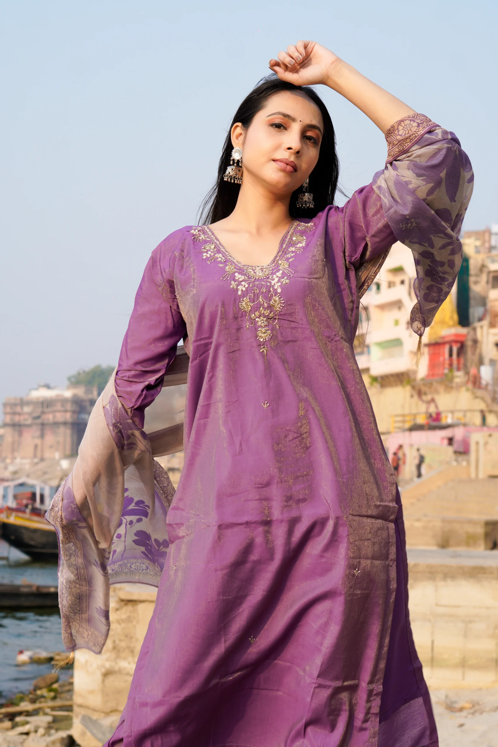 A regal touch for your wardrobe, this deep plum kurta set features delicate golden Zari embroidery that catches the light beautifully. Paired with a sheer printed dupatta, it’s perfect for evening celebrations and festive elegance.