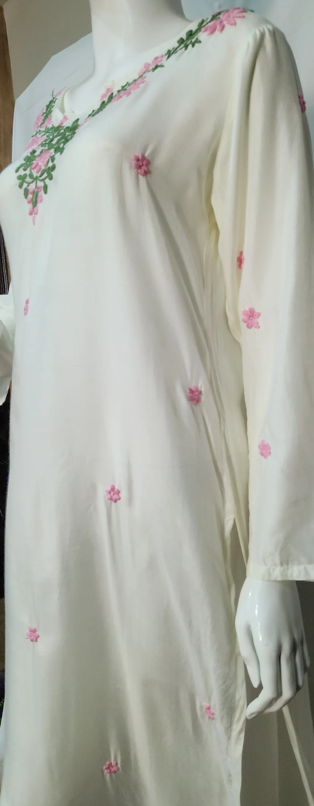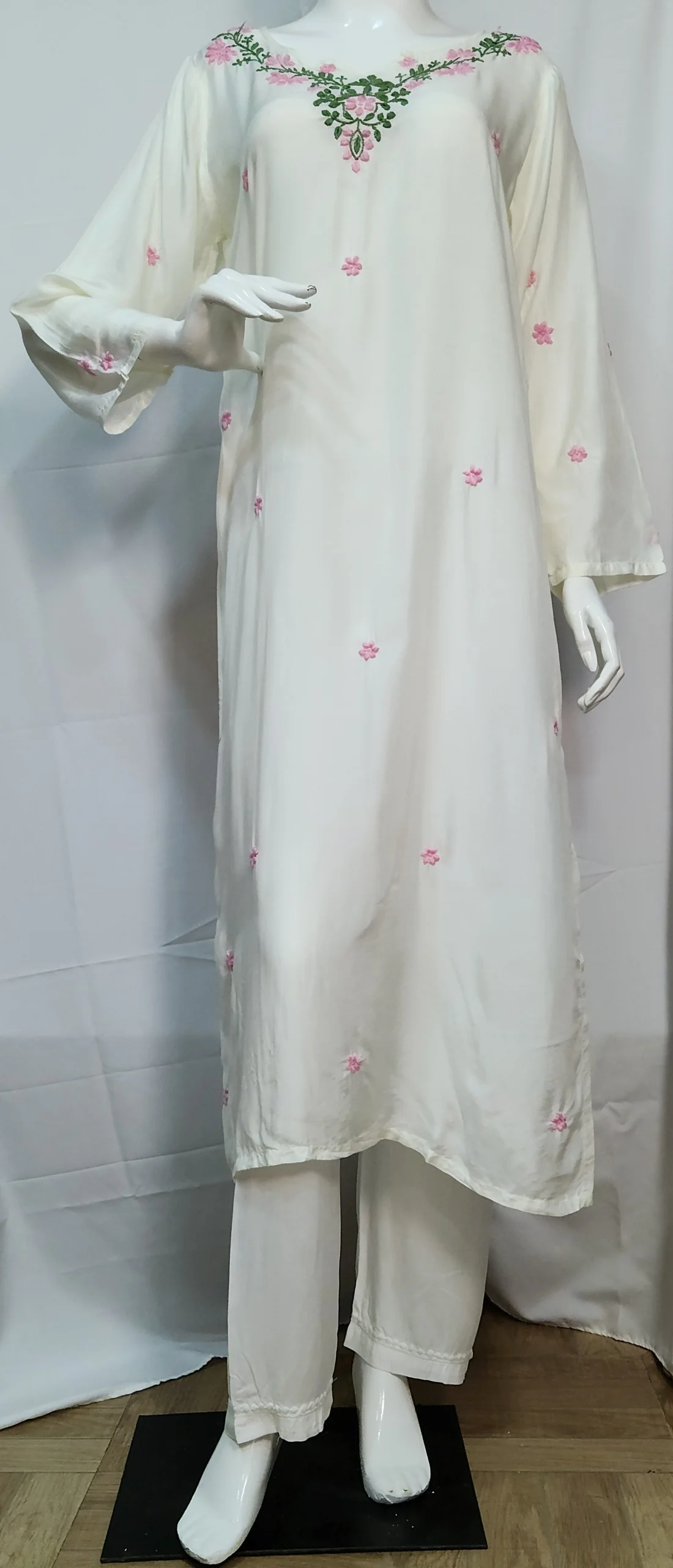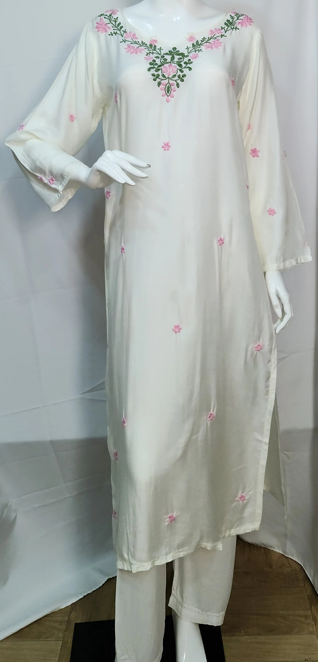 A classic ivory kurta set adorned with delicate pink floral embroidery and soft green vines — a timeless choice for serene elegance and graceful occasions.