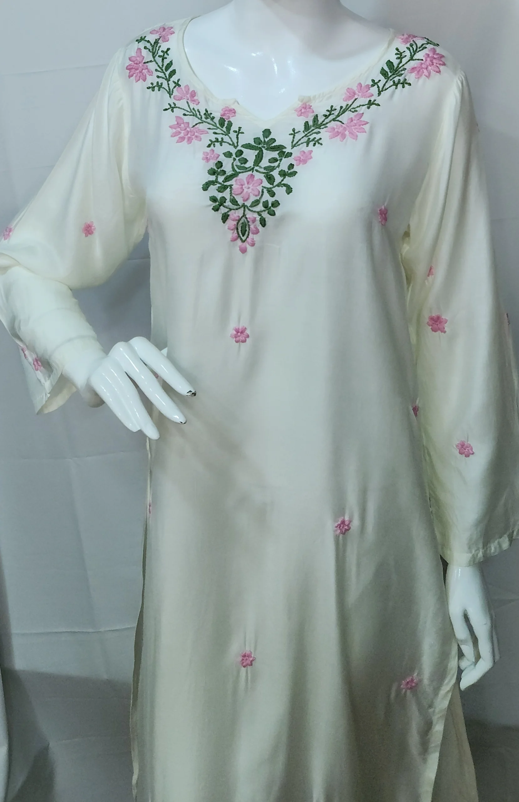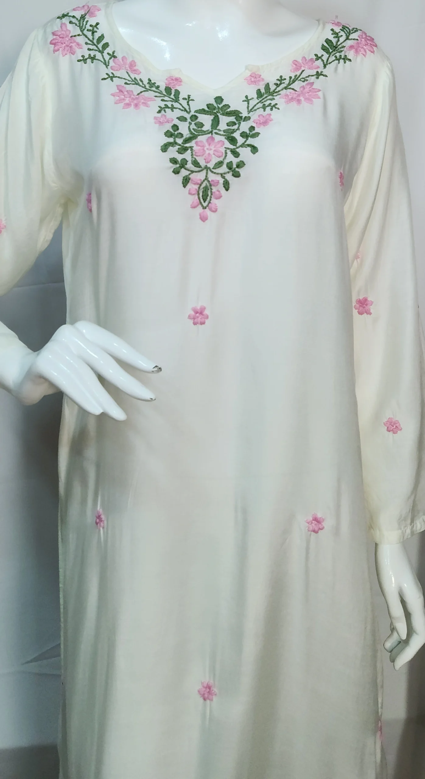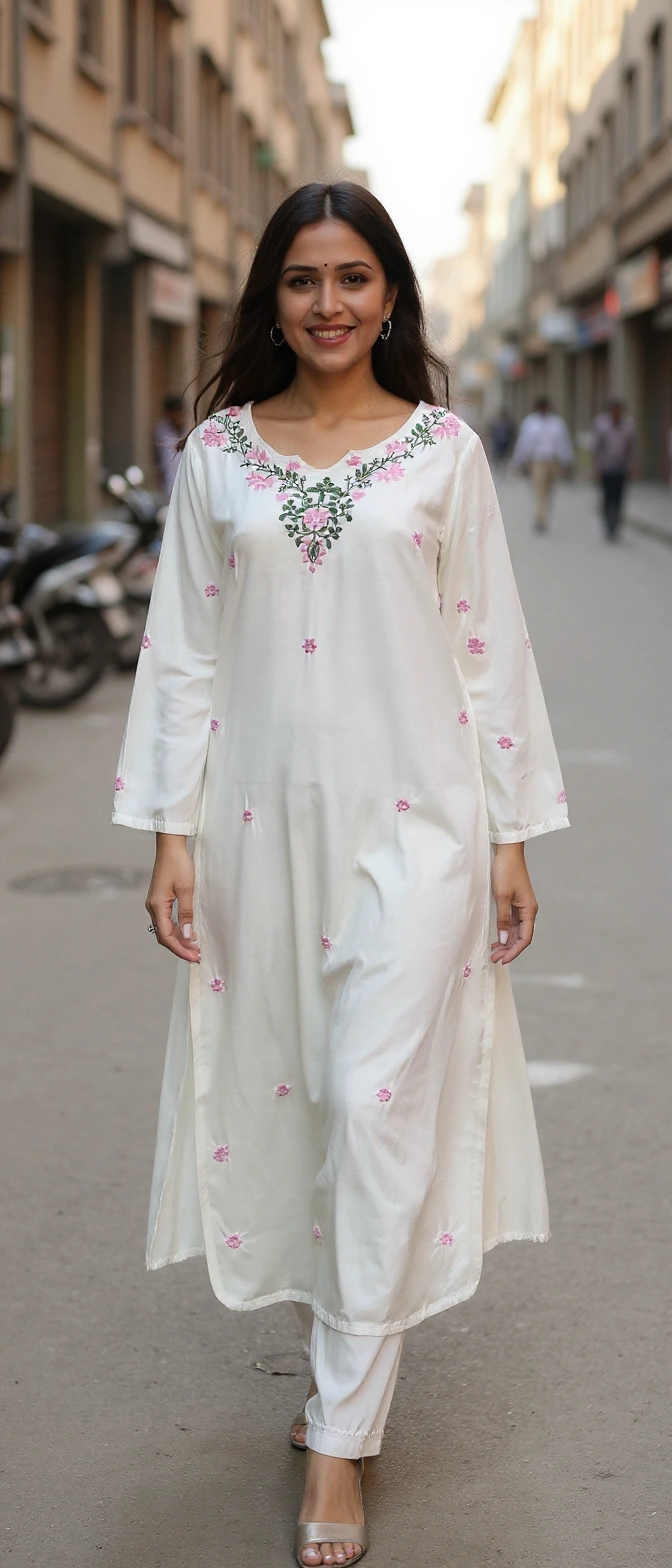 A classic ivory kurta set adorned with delicate pink floral embroidery and soft green vines — a timeless choice for serene elegance and graceful occasions.