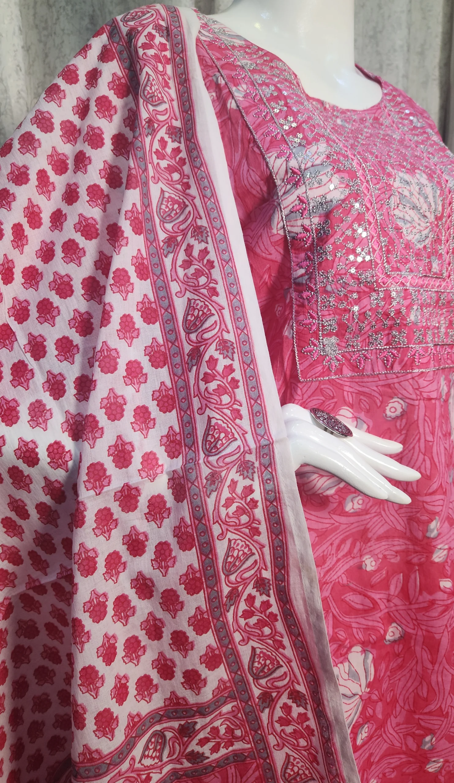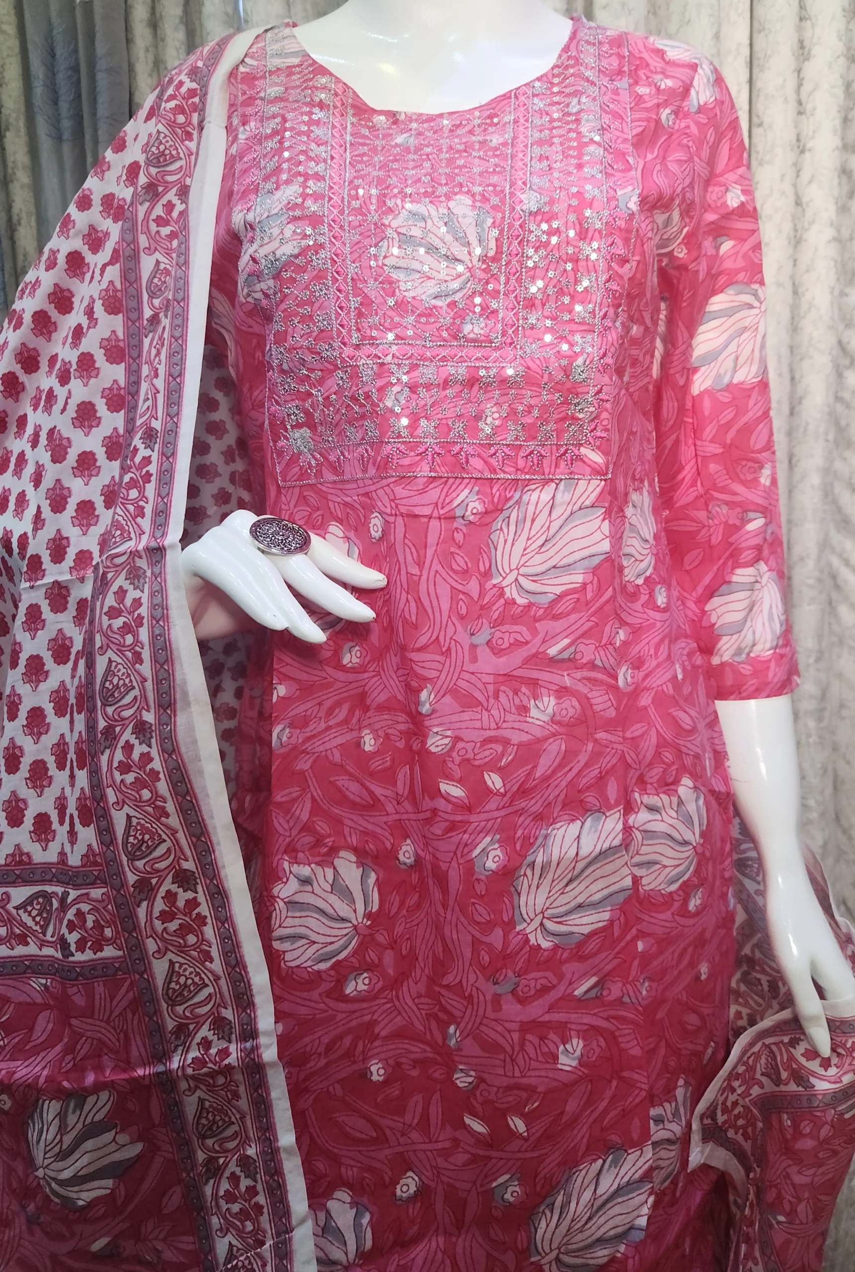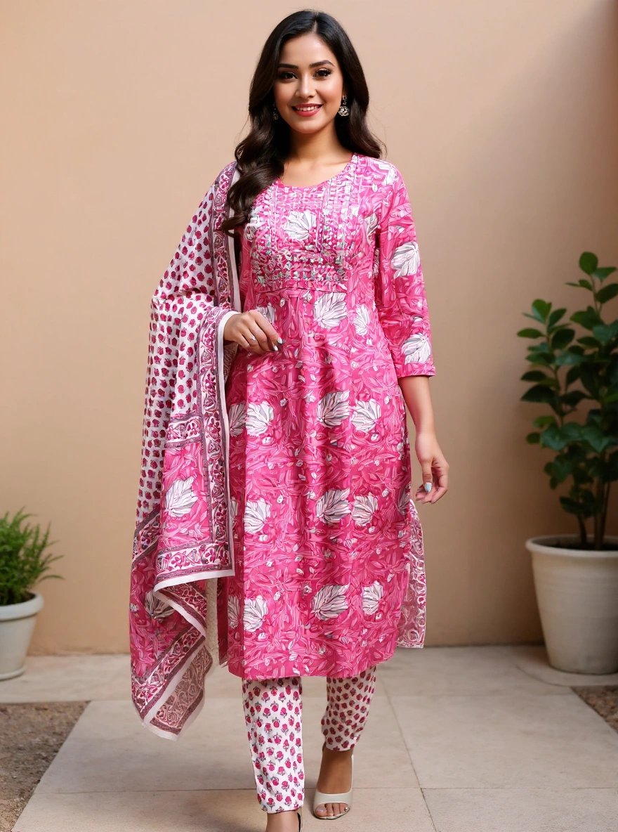 Step into elegance with the Meher Pink Floral Kurta Set, featuring a soft cotton kurta adorned with intricate white leaf motifs, paired with printed pants and a contrasting dupatta. Perfect for casual gatherings and festive flair.