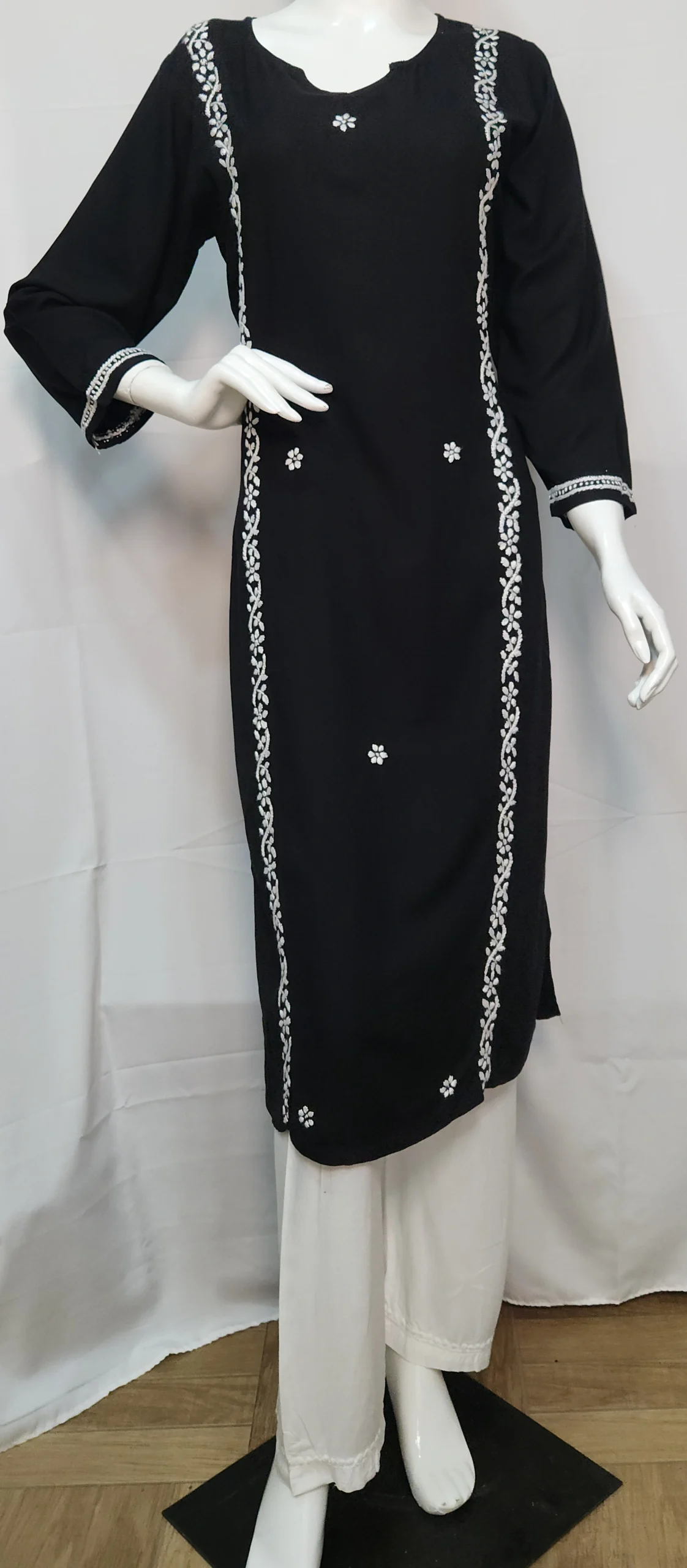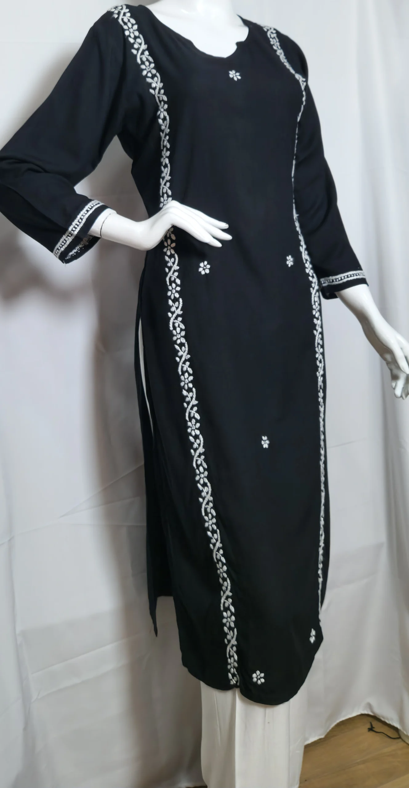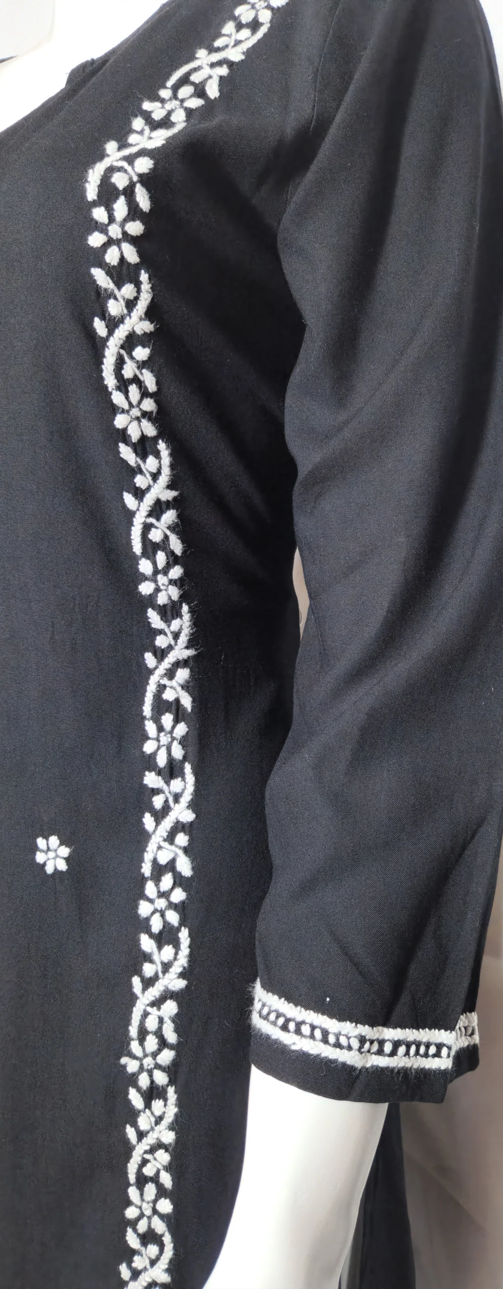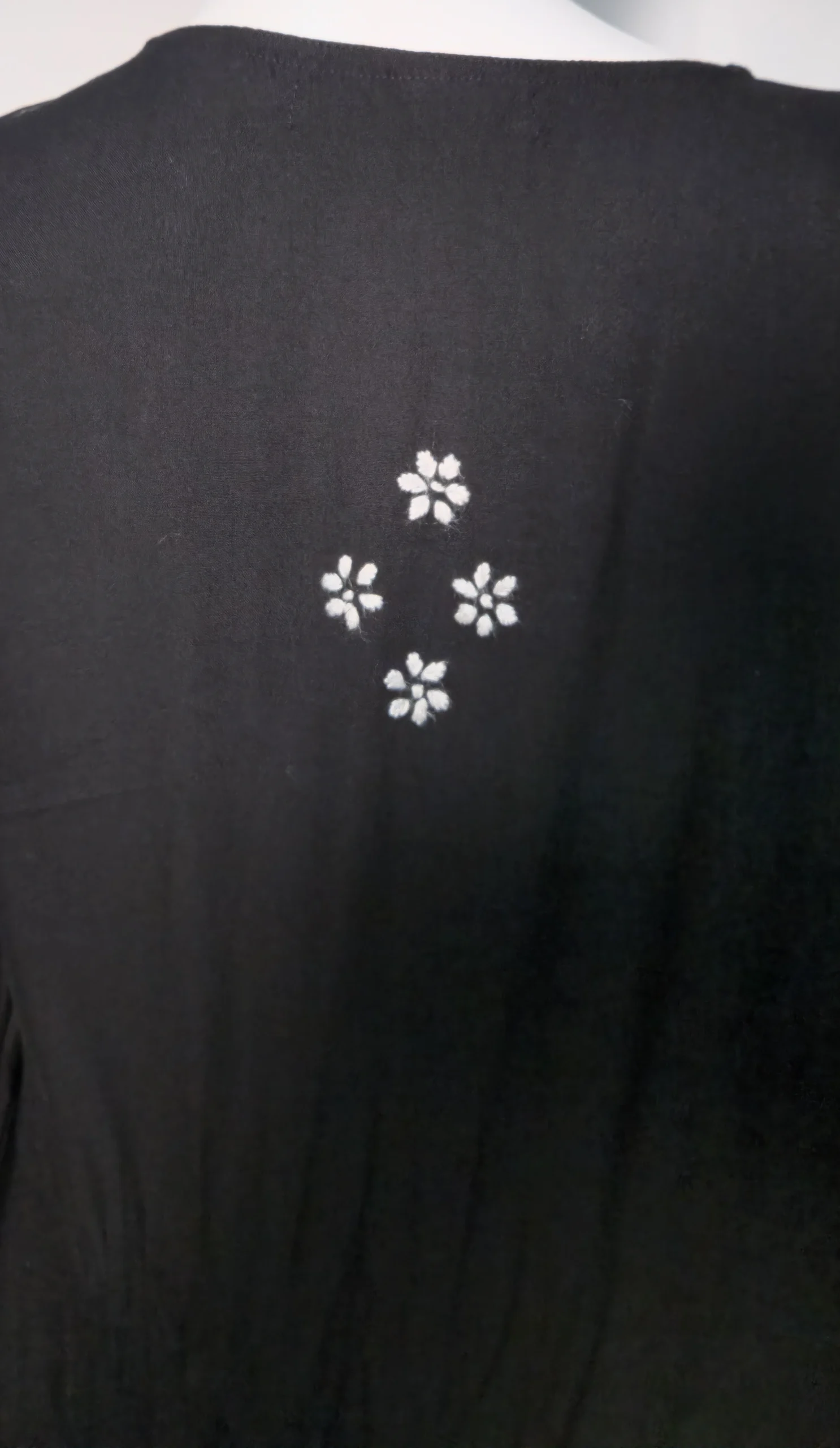 An elegant black kurta adorned with delicate white floral embroidery and sleek detailing — a timeless piece for effortless sophistication and versatile styling.