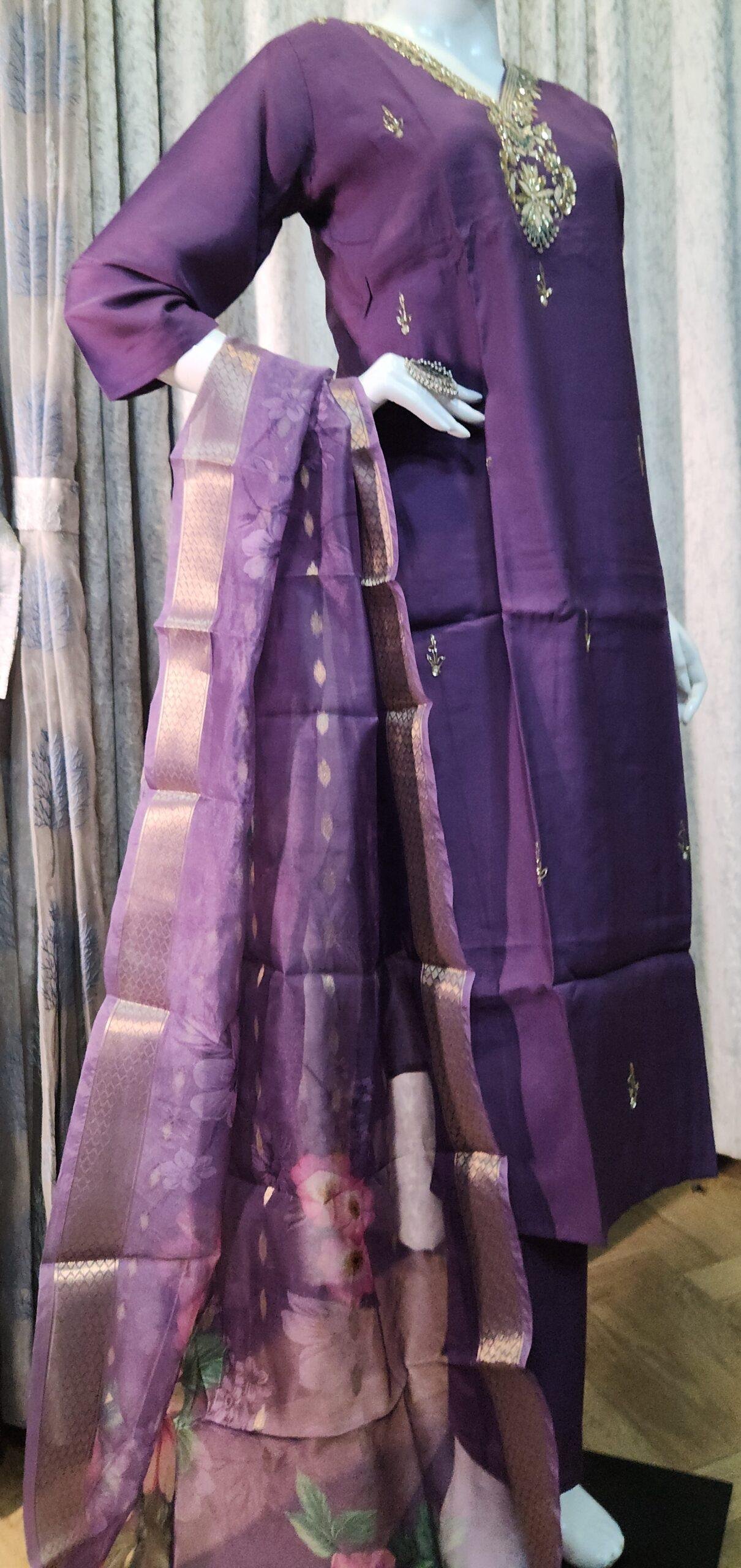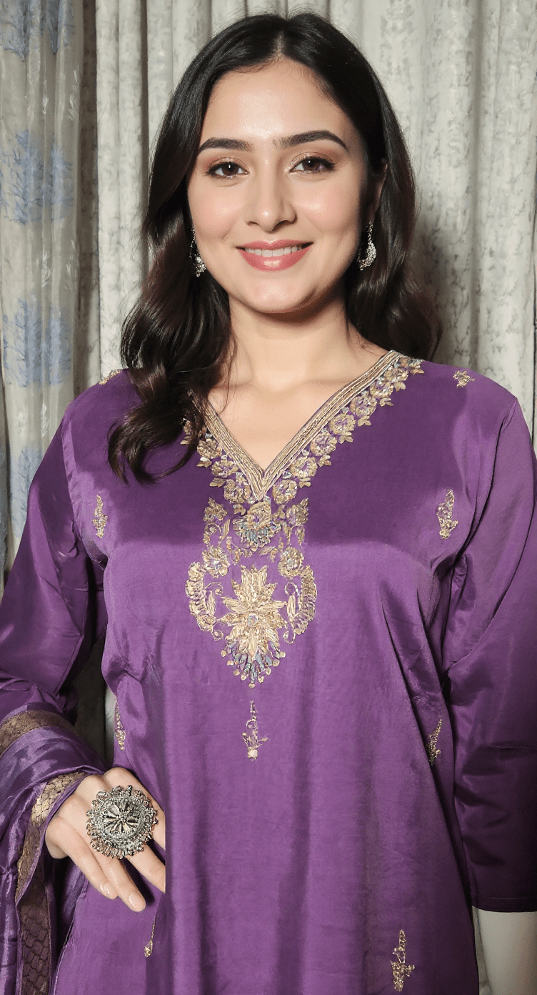 An elegant plum kurta set with intricate golden embroidery and a sheer floral dupatta—crafted for timeless festive charm.