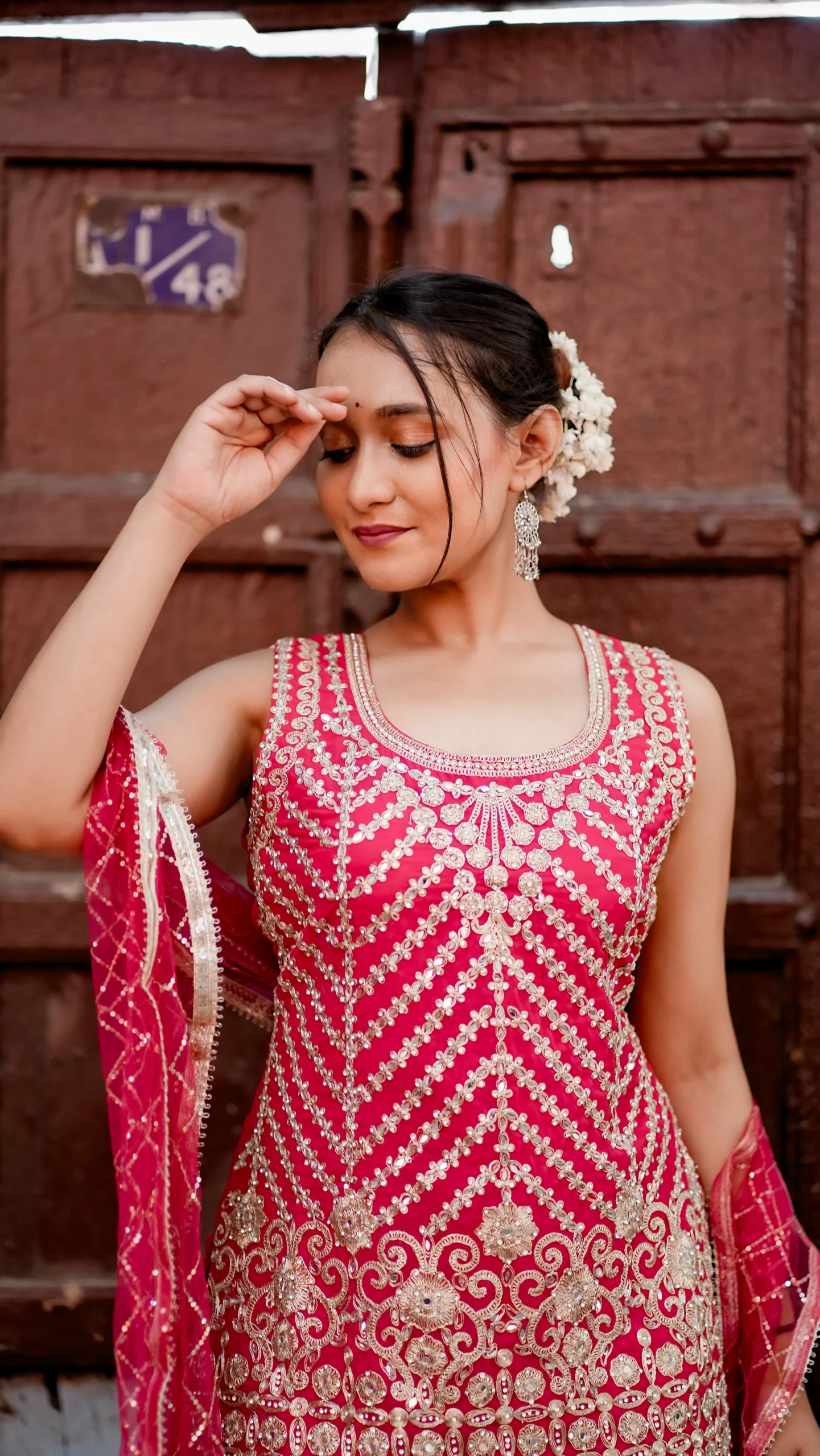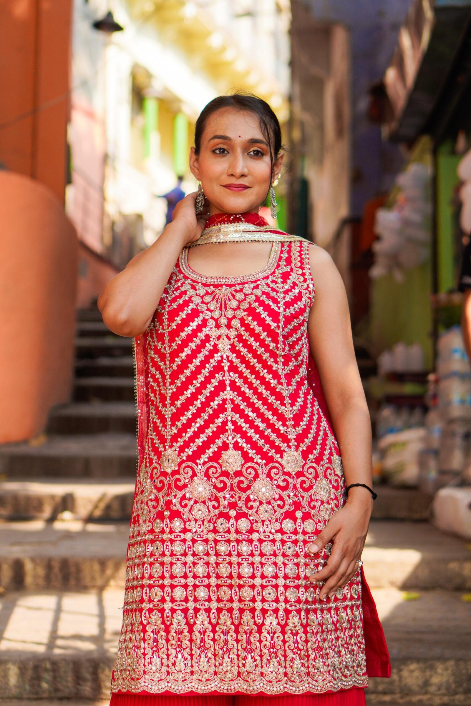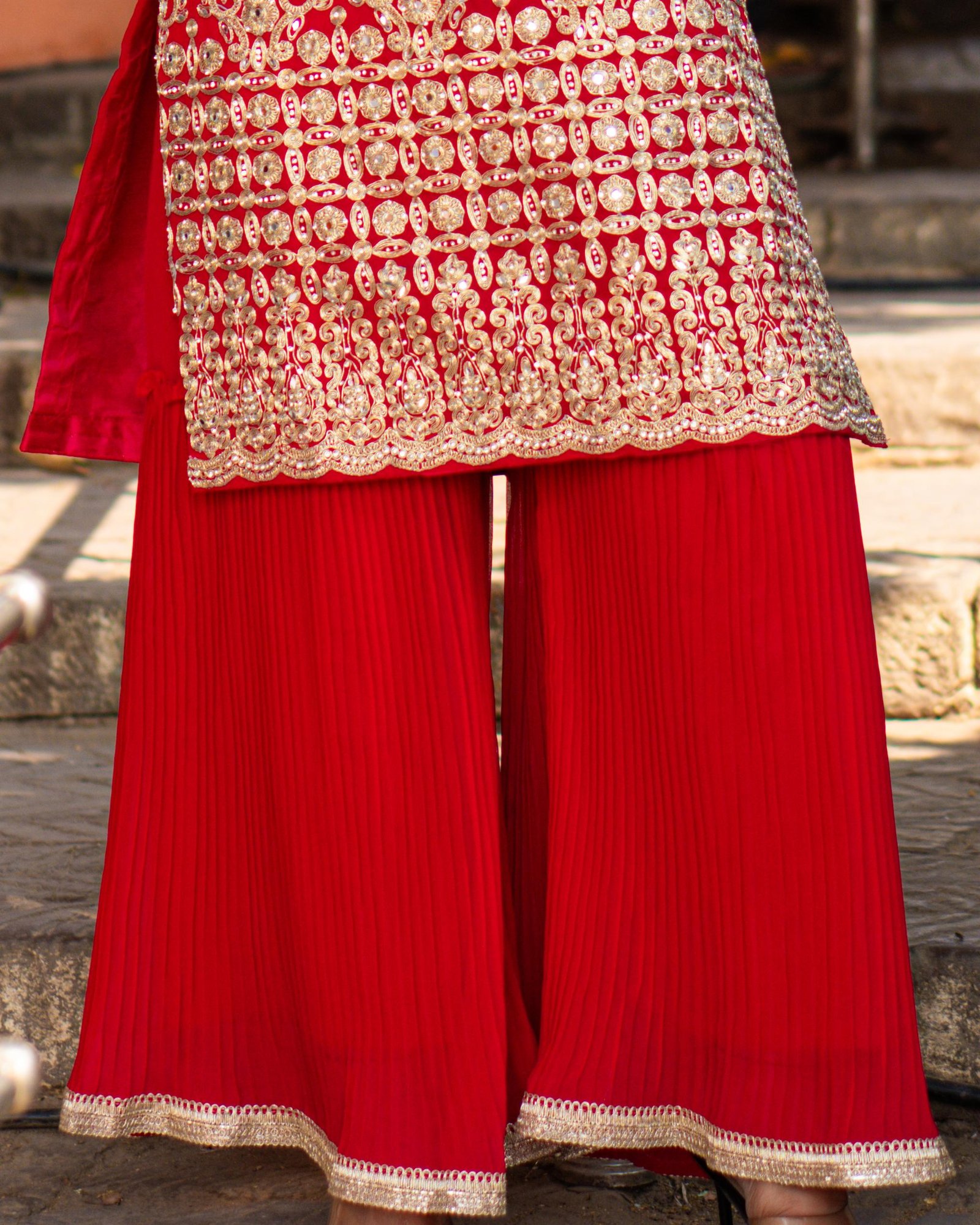A stunning red Anarkali-style kurti intricately embroidered with shimmering zari and sequin work, paired gracefully with a matching flared plazo. Crafted for festive occasions and celebrations, this outfit blends traditional charm with modern comfort, ensuring you shine with effortless grace.