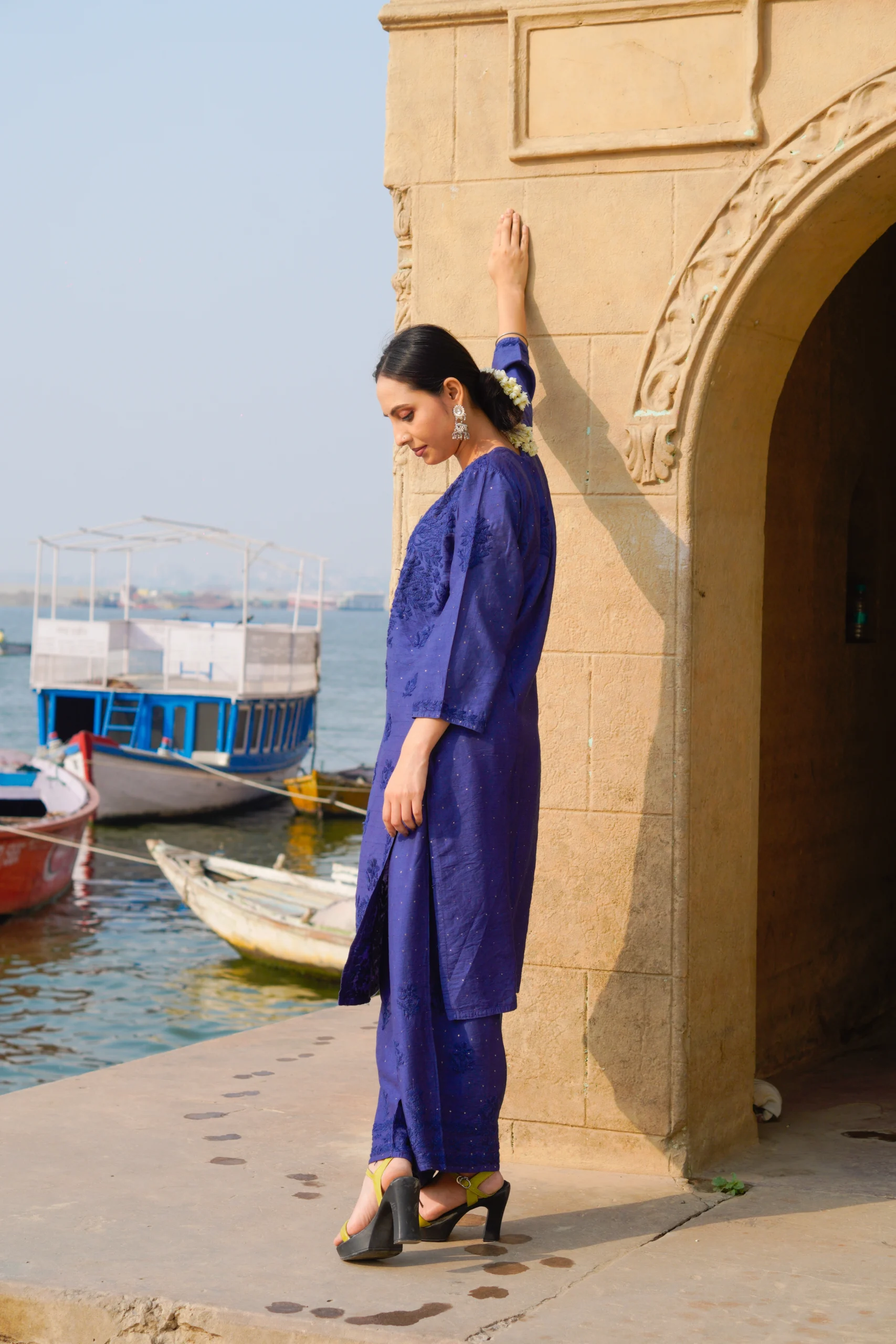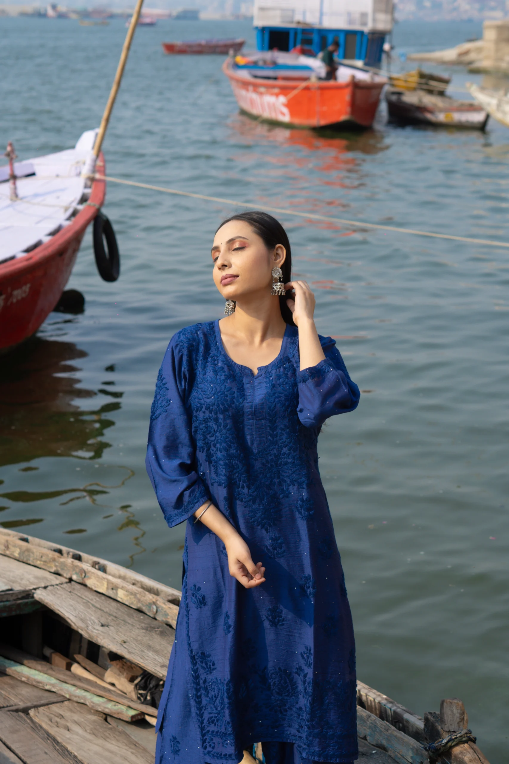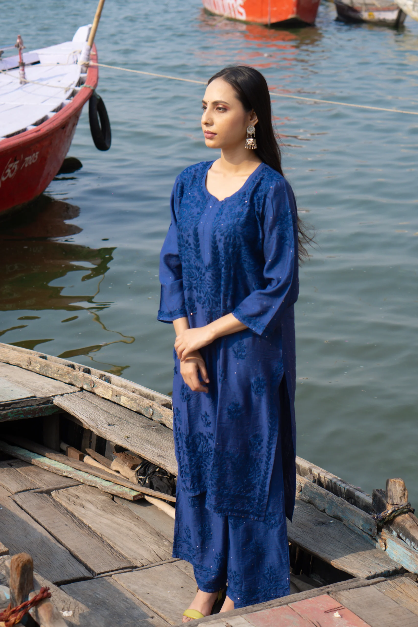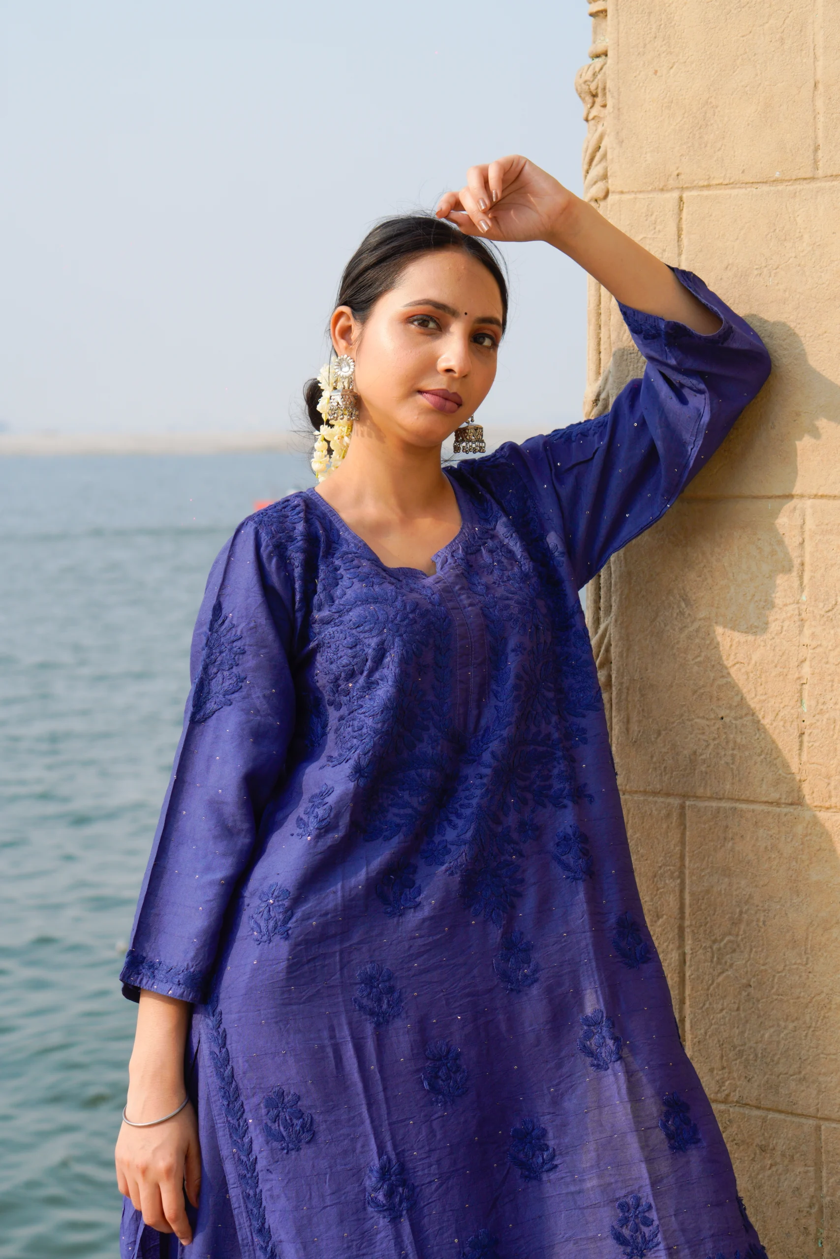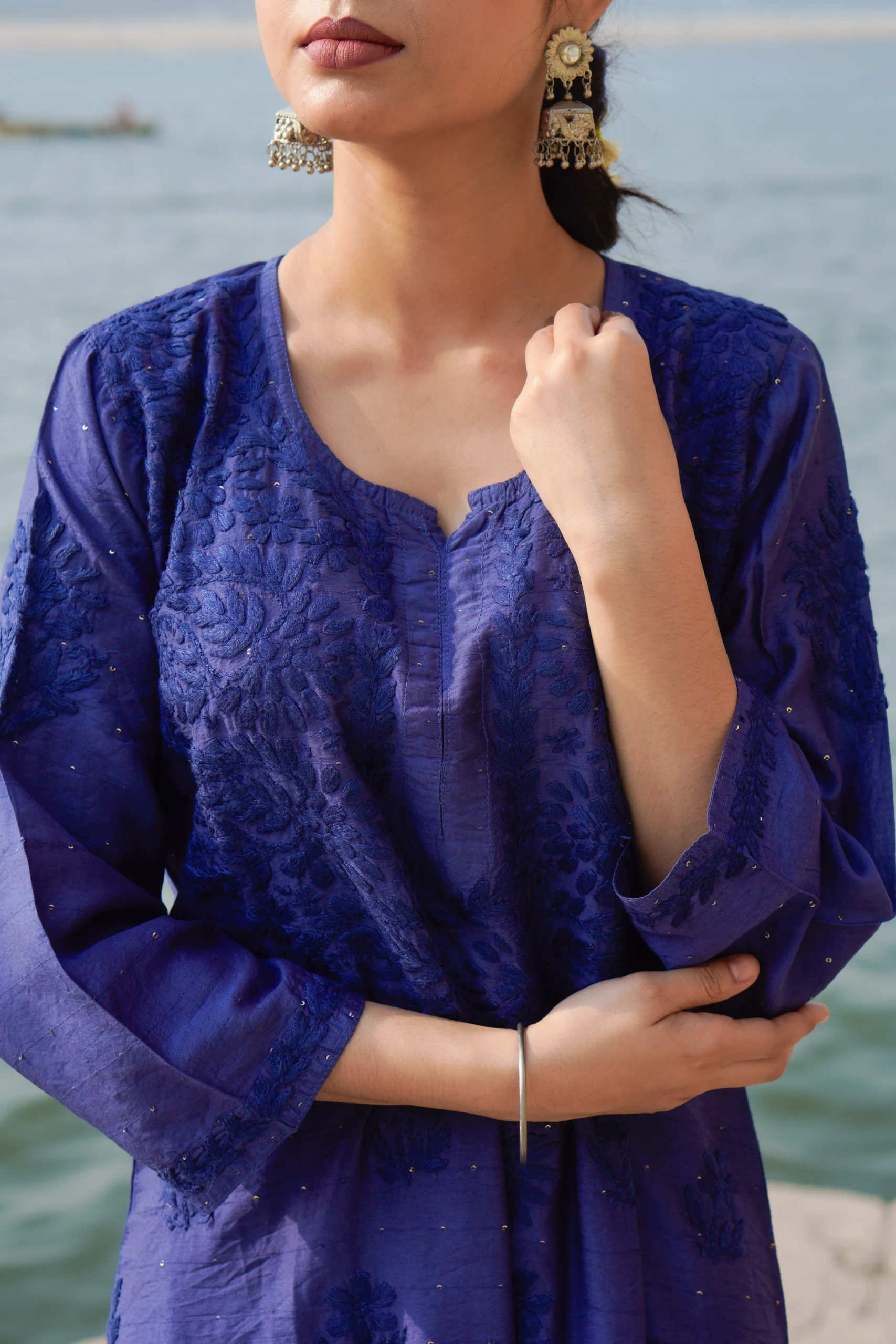 A tribute to the timeless elegance of Chikankari, this deep blue kurta set features delicate hand embroidery on a rich, soft fabric. Perfect for festive mornings or serene evenings, it blends tradition with poise—just like a blooming Neel Kamal by the waterside.