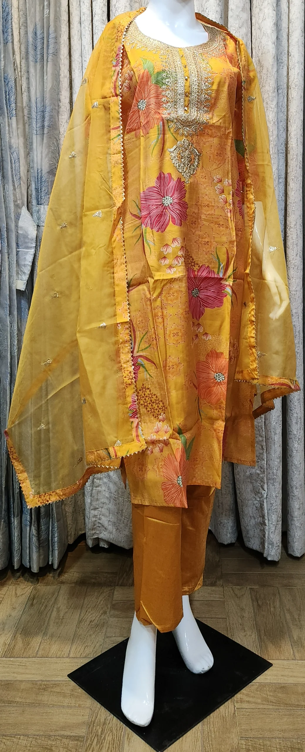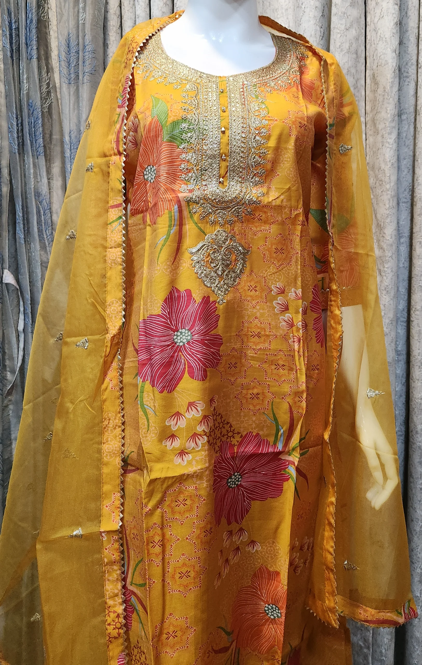 Radiate festive charm in this mustard silk kurta set featuring vibrant floral prints, delicate mirror work, and a sheer embellished dupatta. A perfect pick for celebrations and special occasions.